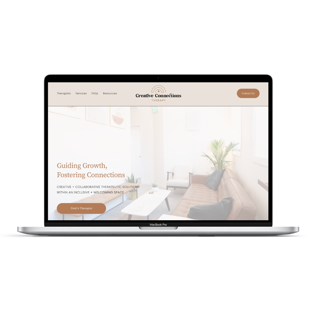 Open laptop on a soft, light-colored surface displaying a website for a therapy practice called Creative Connections Therapy, with a welcoming living room image on the screen.