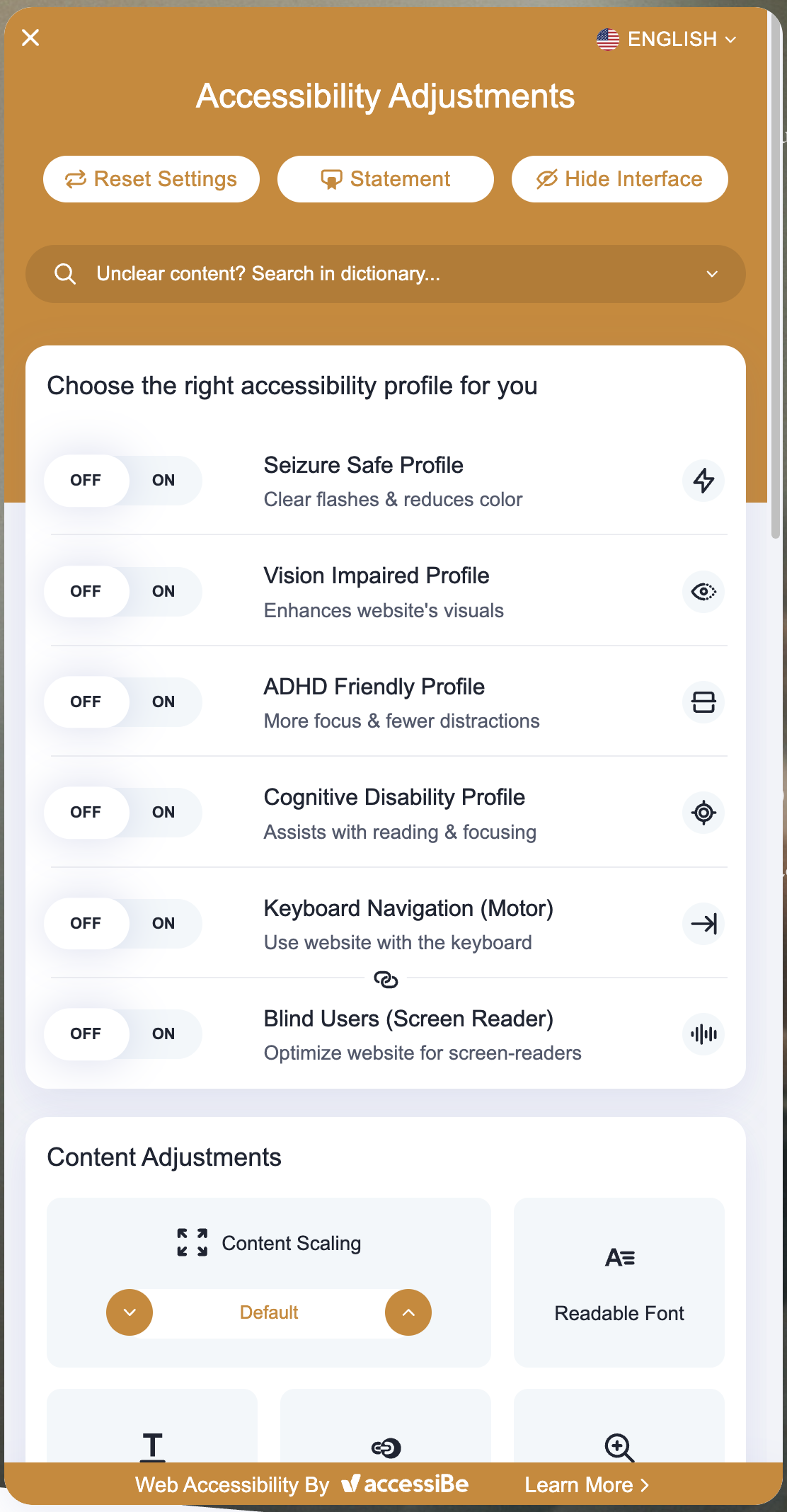 Customizable Interface: Users with disabilities can personalize their browsing experience through accessiBe's accessibility interface. This allows them to adjust font sizes, color schemes, animations, and more to suit their individual needs.